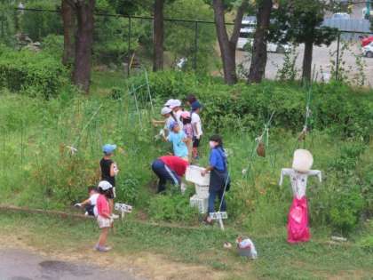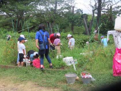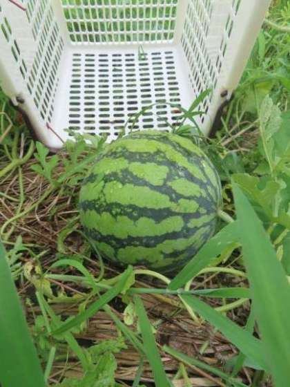 2年生が生活科でスイカを育てています。だいぶ大きくなってきました。おいしいスイカを収穫できるように、白いかごをかぶせてスイカを動物から守ります。