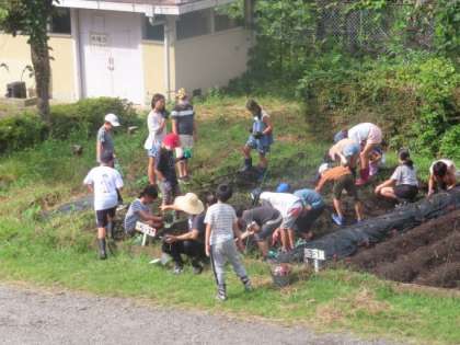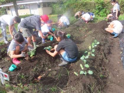 5年生が畑にブロッコリーや芽キャベツなどの苗を植えました。作業に慣れていて手際よく進めていました。