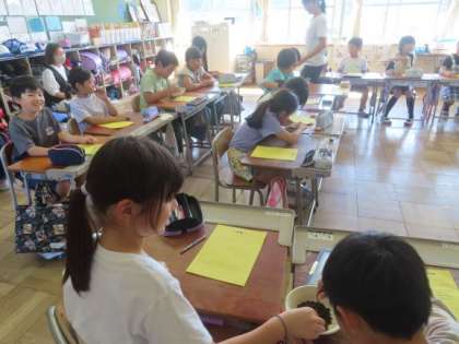 赤土を栄養のある土にするために、いろいろなものを混ぜているそうです。紙のお皿に入れた物を手で触ったり匂いを嗅いだりしました。後で「牛の糞」であったことを知らされると、子どもたちは驚いていました。発酵していると、匂いがありません。