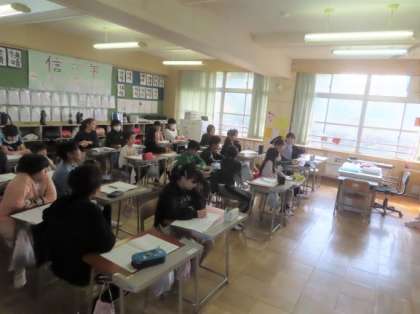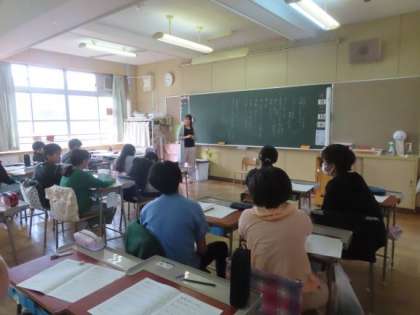 6年生がキャリアパスポートにある「学校行事頑張りカード」に運動会のことについて記入します。写真は運動会の学年全体の目標について、話し合っているところです。この目標を受けて、大切なこと、自分のめあてなどを記入していきます。
