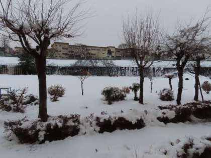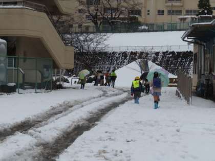 校庭が真っ白になっていました。朝早く到着した職員が校門周辺の歩道、校門から昇降口までの間を通りやすくするため、雪かきをしました。子どもたちは、いつも通り元気に登校を始めました。