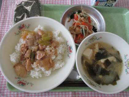 今月、給食で使用する八王子産の野菜は、大根、キャベツ、かぼちゃ、小松菜、人参、白菜、長ねぎです。長ねぎは、今が旬です。長ねぎの辛み成分「硫化アリル」は、ビタミンB₁の吸収を助け、血行促進、肩こりや疲労回復などに効果が期待できます。今日は、焼き鳥丼に、長ねぎをたっぷり入れました。じっくり焼いたので、甘みが引き出されています。味わってみてください。