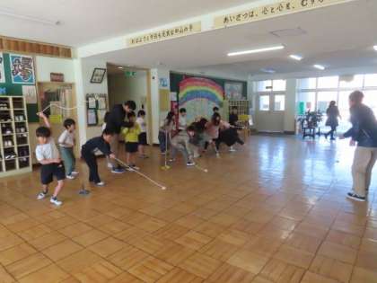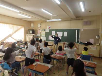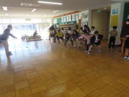 1年生がこま名人から、こまの回し方を教わりました。まずは、教室で「お天気ジャンケン」で準備運動をしました。その後、校庭が使えないため、集まれ広場でこまを回しました。