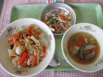 中華丼の具は、たくさんの野菜とえびやいかなどの魚介類をつかった料理です。野菜は、短冊切りにし、油で豚肉と火の通りにくい野菜から炒めていきます。水を入れてしばらく煮込みます。塩・こしょう・しょうゆで味つけし水ときでんぷんでとろみをつけます。