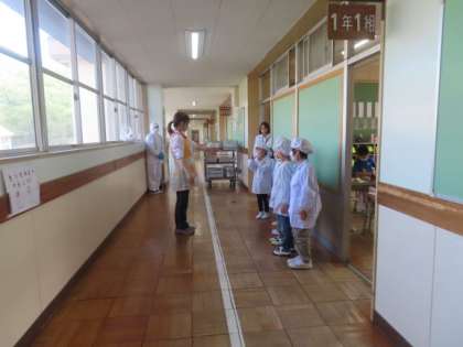 給食当番は、覚えることがたくさんあります。1枚目の写真は、白衣やマスクなどの確認をしているところです。給食当番の子どもたちは、全税の説明を聞き、上手に配ることができました。