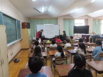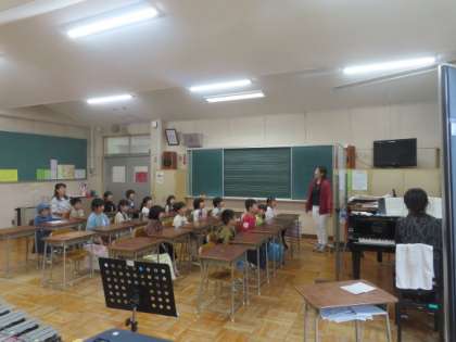廊下まで元気な歌声が届いていたので音楽室に入ると、1年生が校歌を歌っていました。この調子なら、早く覚えることができそうです。