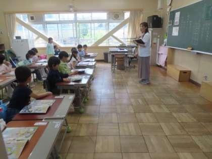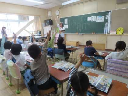 1年生が国語で「なかよしのみち」の学習をしました。挿絵をもとに話を想像し、気づいたことを話し合っていました。手のあげ方も教わりました。