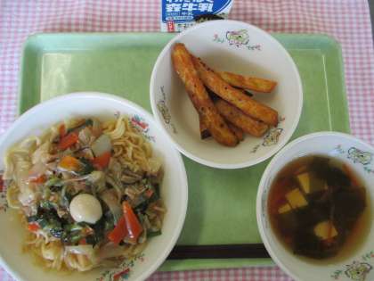 スティック大学芋は、拍子切りにした冷凍のさつまいもを素揚げし、甘辛いたれとからめます。給食でも人気のメニューです。わかめと豆腐のスープは、だし汁に材料を入れて煮込み、塩・こしょう・しょうゆで味つけし、水ときでんぷんでとろみをつけます。このスープは、時間をかけずに作れるので、朝ごはんのスープとしてもおすすめします。