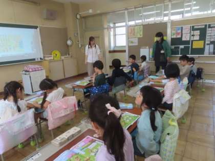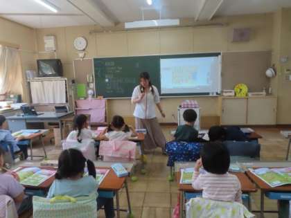 1年生が2つのものの集まりの要素を線で結び、数の多少を調べました。教師用のデジタル教科書で絵を提示すると、子どもたちは集中してみていました。
