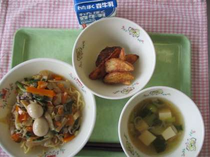 7月の八王子産野菜は、大根、きゅうり、じゃがいも、玉ねぎ、キャベツ、ズッキーニ、トマト、かぼちゃ、なす、ピーマン、こまつな、にんじん、チンゲン菜、ミニトマト、とうもろこしが登場します。今日は、あんかけやきそばに玉ねぎ・にんじん、チンゲン菜と豆腐のスープに、チンゲン菜・玉ねぎを使っています。八王子産の野菜をたくさん味わってください!