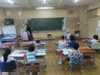 1年生が算数でひき算の学習をしています。今日は、具体的な場面を式に表しました。絵や図をもとに考えると分かりやすいようです。