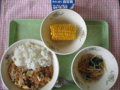 「とうもろこし」は、米、麦と並んで「世界の三大穀物」の一つです。種類によって、穀物と野菜に分かれていて、給食で使われているスイートコーンは、野菜の仲間です。今日は八王子産のとうもろこしを茹でて食べます。