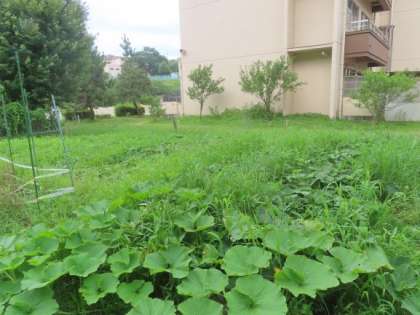 サツマイモ畑が雑草でいっぱいになっています。雨や暑さで草取りをすることがなかなかできません。