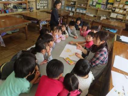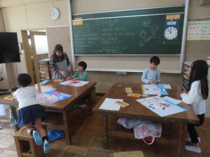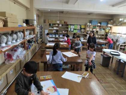 1年生が「うんどうかいのえ」を描きました。1枚目の写真は、先生が人の描き方を教えているところです。その後、自分の席に戻り、運動会の思い出を絵にして表しました。