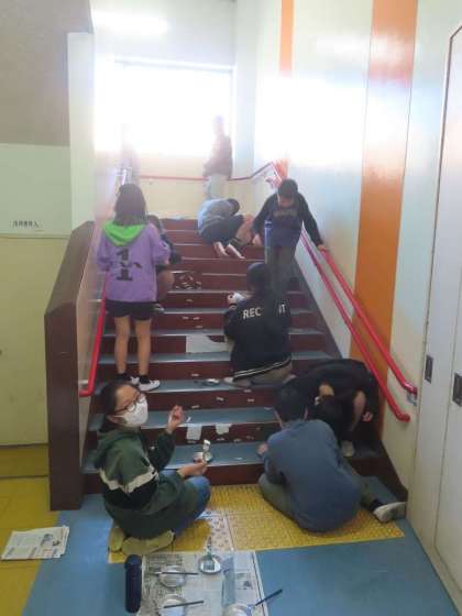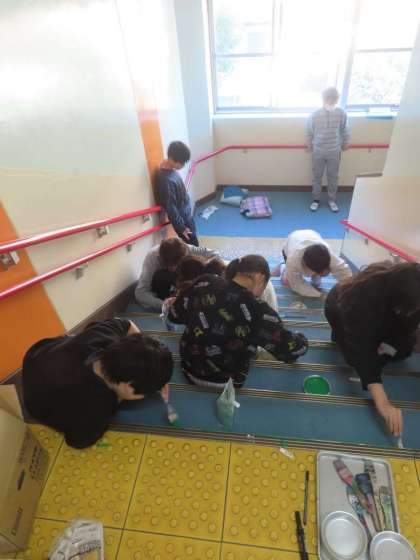 6年生が卒業制作で、東側の階段に絵と言葉をかいています。中山小学校への思いを込めた絵や言葉です。