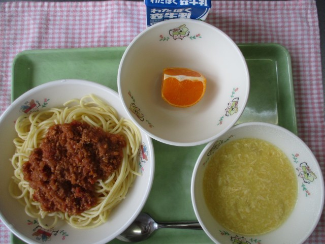 【本日の献立】スパゲティミートソース 牛乳 コーンと卵のスープ果物 「野菜を1日...