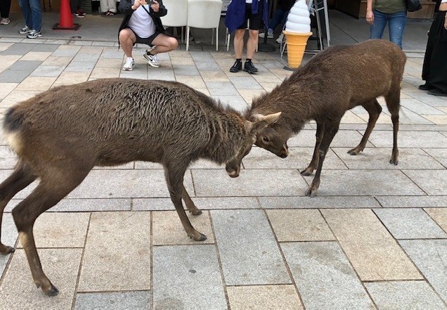 角を切られた牡鹿が、角の残りで張り合っていました。