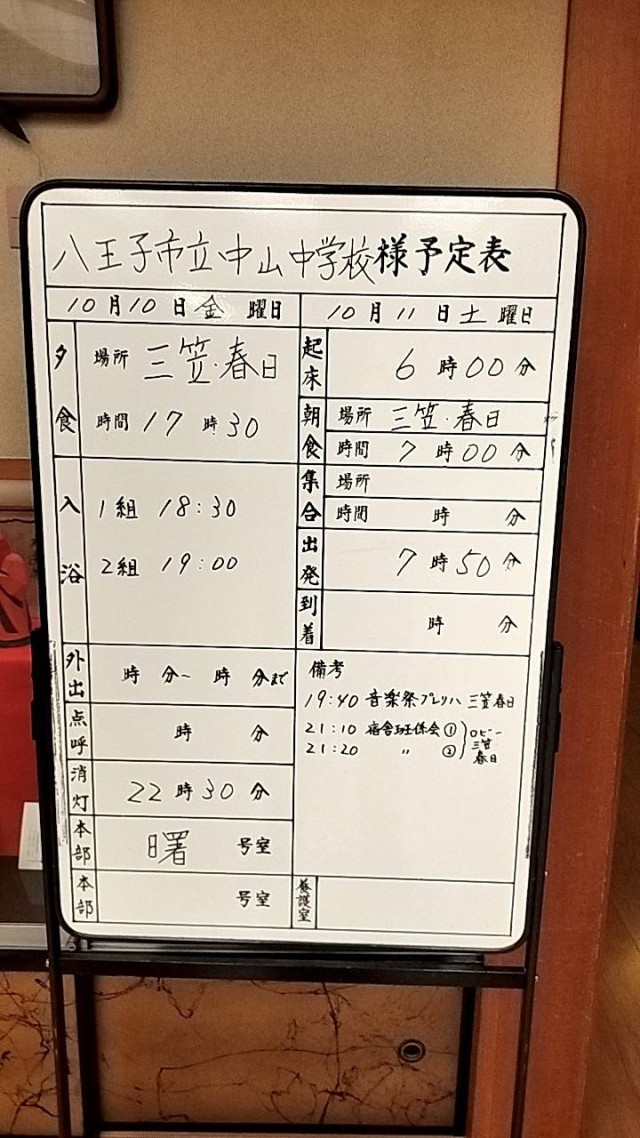 「宿舎班係会①②」「行動班係会」「部屋会議」「就寝準備」「消灯・就寝」の予定です。