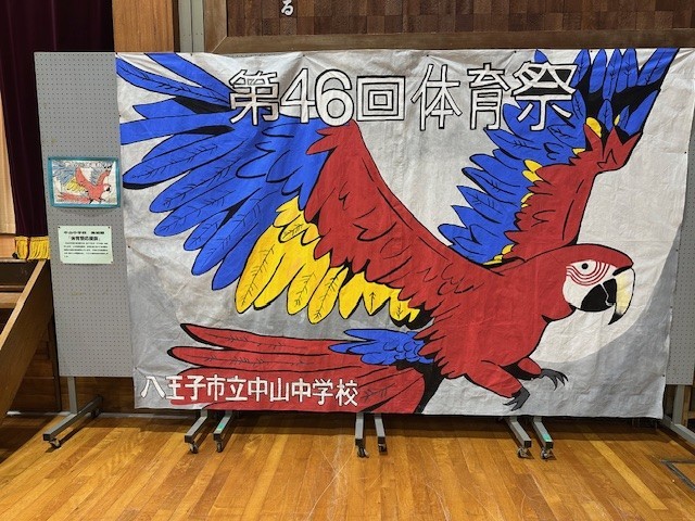 中山中学校美術部の作品「体育祭応援旗」が正面舞台横に堂々と飾られていました。