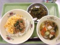 19日の給食は「卒業おめでとう献立」の赤飯、鰆の西京焼き、いりどり、彩り和え、果...