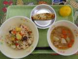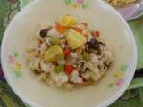 秋の彩りごはんには、鶏肉・干ししいたけ・しめじ・にんじん・油揚げ