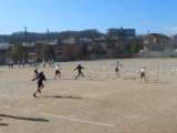 5年生が体育で「ハードル走」の学習をしています。インターバルの距離やハードルの台数などのルールを定めて競争したり、自己の記録の伸びや目標とする記録の到達を目指したりしながら、ハードルをリズミカルに走り越えることができるようにします。