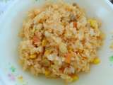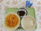 22日の給食は大豆ピラフ、あじのパン粉焼き、じゃがいものポタージュ、牛乳です。大豆ピラフと聞くと何味だろう?と思う方もいるかもしれません。大豆がたっぷりはいったケチャップ味のピラフです。教室ではおかわりの列に並ぶ子も多かったです。