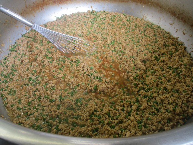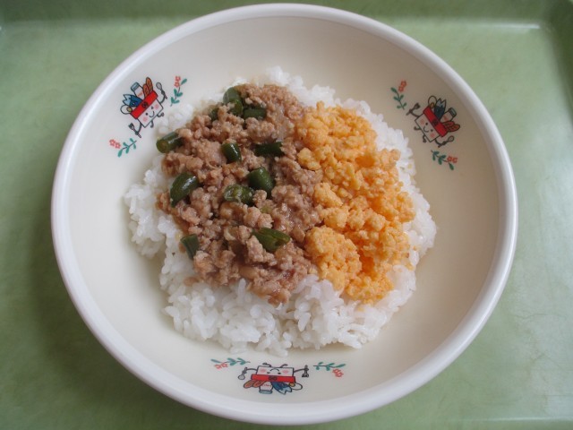 なかなか固まらないのですが、固まり始めると早いです。ずっと混ぜ続けて、細かい「いりたまご」に仕上げます。ごはんの上に、肉そぼろとのせたら、出来上がりです。箸で食べると、箸の練習になるのですが、しっかり残さず食べてほしいので、スプーンをつけました。ごはんも肉そぼろもいりたまごもきれいに集めて、途中あきらめることなく食べることができ、残りも驚くほど少なかったです。