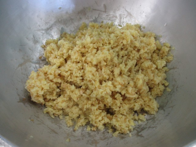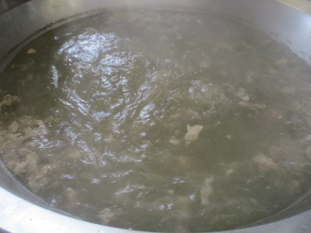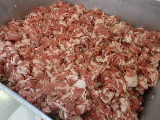 しょうが焼きには豚肉を44キログラム使いました。しょうが焼きに使用する「根しょうが」の半分をみじん切りにして大きな釜のたっぷりなお湯に入れ、さっと湯通しします。