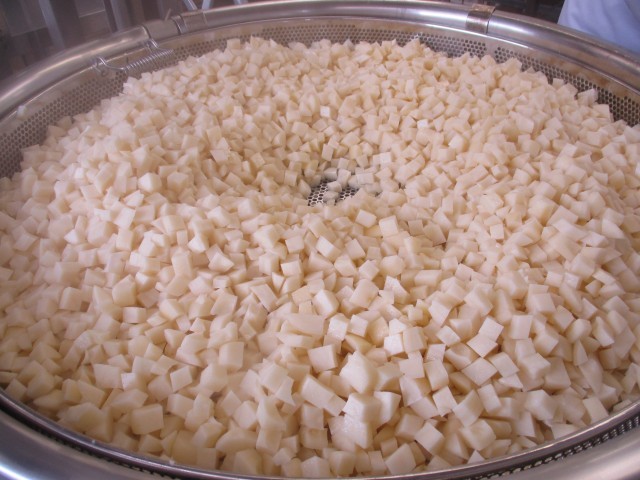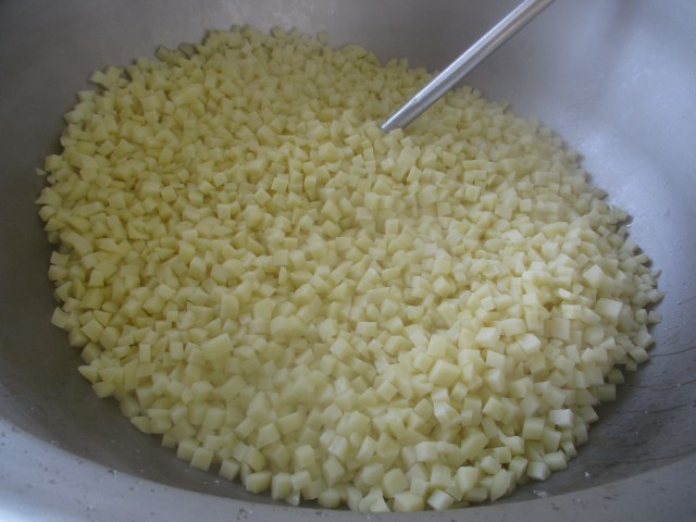 じゃがいもは50キログラム使いました。50キログラムのじゃがいもを1.5cm角に切りそろえ、大きな釜で蒸し上げます。