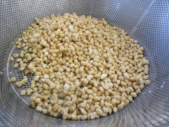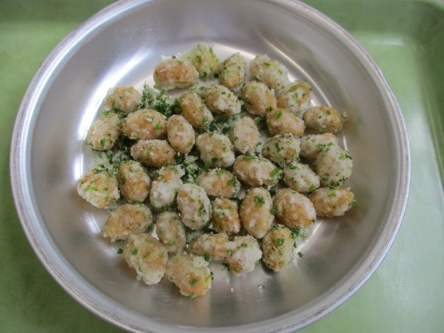 油でカリッと揚げたら、乾煎りしておいた「青のり」と「塩」をまぶして出来上がりです。豆が苦手な子でもおいしく食べることができます。ぜひ、ご家庭でもいかがでしょうか?