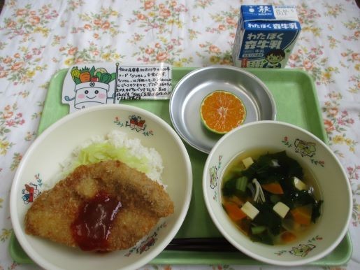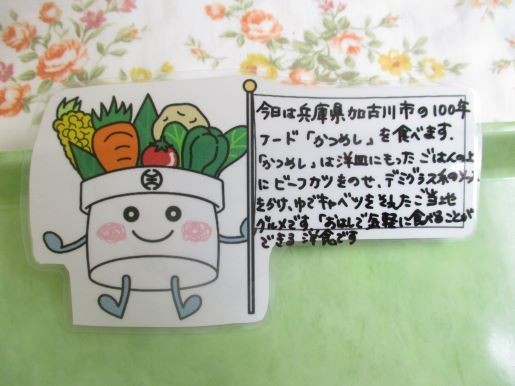 29日の給食は兵庫県加古川市の100年フードの「かつめし」、青菜と豆腐のすまし汁、果物(みかん)、牛乳です。100年フードとは、地域の食文化を未来に向けて100年続けていくことを目指した、文化庁の取組です。現在、全国で300件の食文化が認められています。今回は兵庫県加古川市100年フード「かつめし」です。かつめしは、洋皿に盛ったごはんの上にビーフカツをのせ、デミグラスソース系のソースをかけて、ゆでキャベツを添えた、加古川市のご当地グルメです。「おはしで気軽に食べることができる洋食」として親しまれています。給食では「手作りとんかつ」をのせていただきました。