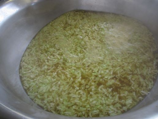 「かつめし」に添える茹でキャベツはカレー風味です。キャベツを茹でるお湯にカレー粉を加えて、キャベツを茹でます。茹で上がったキャベツの水気を切って、乾煎りした塩を和えて出来上がりです。