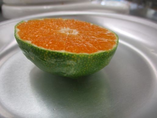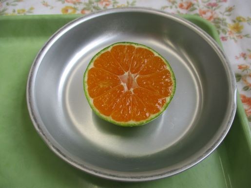 今年収穫されたみかんが登場しました。今年は例年以上に暑かったため、冷凍みかんが早々に終売となってしまいました。早生みかん(生育が早い品種)なので、皮が緑色のものが多く、「すっぱいのでは?」と思われがちで残りも多いかなと思ったのですが、あるクラスでは2個のみかんにおかわりじゃんけんする子が続出!担任の先生もどう分けたらよいか考えていました。皮は緑色でもオレンジ色の皮のみかんと甘酸っぱさはほとんど変わりません。