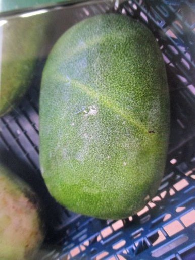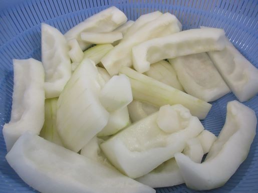 有機野菜とは、化学的につくられた肥料や農薬を使わずになるべく生き物や環境への負担をかけないように作った野菜です。学校給食畑では、給食に使う有機野菜を育てています。この日の使った「有機冬瓜」は農薬を使って育った冬瓜より、野菜のつくりが丈夫になり、味に違いがでるそうです。3日の朝、立派な有機冬瓜が納品されました。