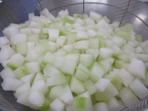 有機冬瓜がメインなので、いつもよりもやや大きめに切りました。しっかりとした立派な冬瓜なので、大きな釜で一度蒸かしてから煮含めました。有機冬瓜を作ってくださった大神さんからメッセージをいただきました。