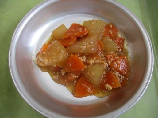 「猛暑と雨不足の影響で、野菜が大きく育ちませんが、試行錯誤しながら、がんばっています。わが子のように愛情を注いだ野菜です。みなさんに「おいしいからこの野菜が食べたい」と思ってもらえるとうれしいです」以上です。冬瓜は給食にあまり登場しませんが、この日のそぼろ煮はとてもよく食べてくれていました。大神さんをはじめ、農家の方々に感謝していただきましょう。