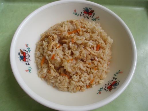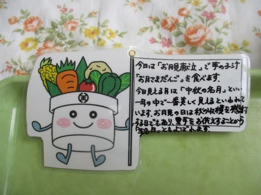 6日の給食は、「お月見献立」のこぎつねごはん、芋の子汁、お月さまだんご、牛乳です。こぎつねごはんにはたっぷりの「あぶらあげ」を入れました。とても人気のメニューです。