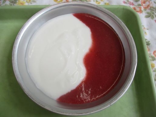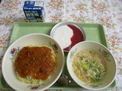 7日の給食は、ドライカレー、レタスとたまごのスープ、ヨーグルトのいちごソースがけ、牛乳です。ヨーグルトと一緒に食べる「いちごソース」は給食室で手作りです。冷凍国産いちごと砂糖だけで作りました。