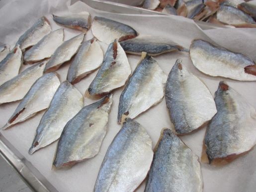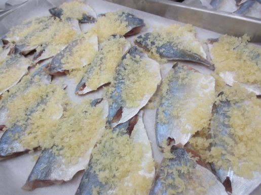 塩、こしょうで下味をつけたあじのフィレを鉄板に並べ、上にパン粉をのせ、オーブンで焼きます。