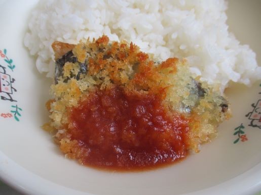 オーブンでこんがり焼き、無着色の中濃ソースをかけたらできあがりです。衣を全面につけて油で揚げるよりヘルシーにできます。この日は白いごはんの残りが驚くほど少なかったです。