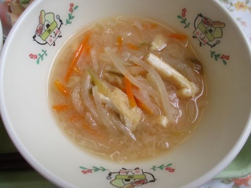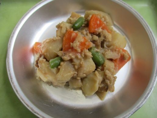 大根の味噌汁の「だし」は煮干しでとりました。大根やその他の野菜は千切りのように切ったので、箸でも食べやすかったです。さといものうま煮には、今が旬の「さといも」をたっぷり使って作りました。ほくほく、とろり。おいしい「さといも」でした。
