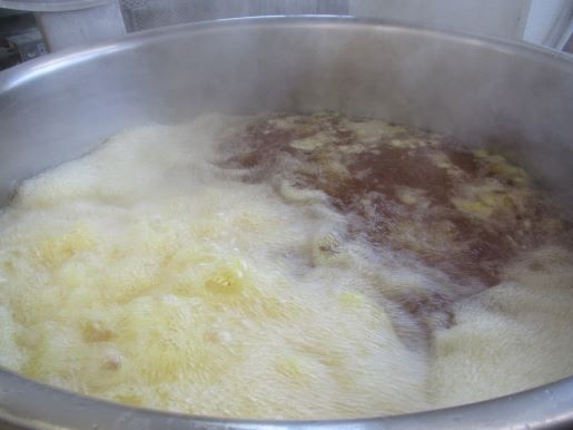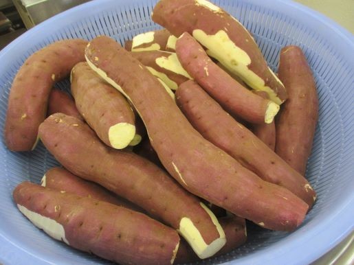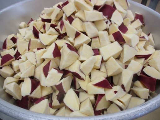 さつまの揚げ芋に使った「さつまいも」は今が旬の八王子産です。食べやすい大きさに切って、油でカリッと揚げます。