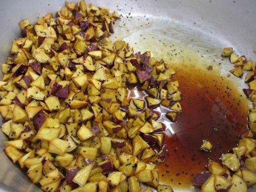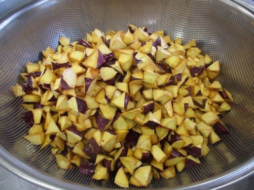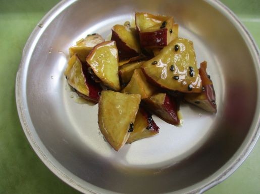 カラっと揚げた芋に給食室で作った甘辛ダレを和えて出来上がりです。残りはちょっぴりでした。