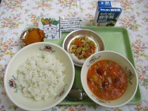 31日の給食はガーリックライス、ビーンズトマトシチュー、オニオンドレッシングサラダ、スイートパンプキン、牛乳です。