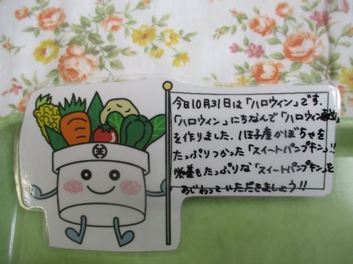 「ハロウィン」とは10月31日に行われる祭りのことです。もともと、秋の収穫を祝い、悪霊を追い払うヨーロッパのお祭りでしたが、最近はお化けの仮装やパーティーを楽しむイベントになりました。給食では八王子産の「かぼちゃ」を使った「スイートパンプキン」を作りました。