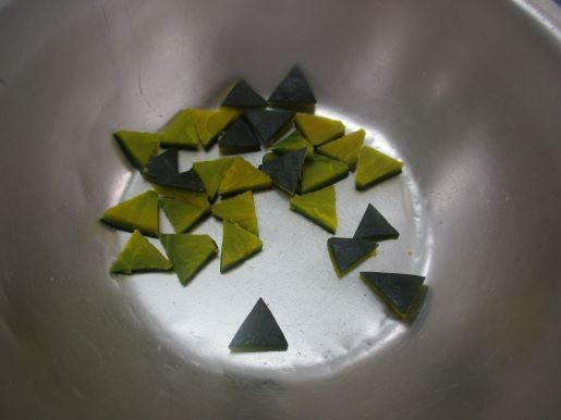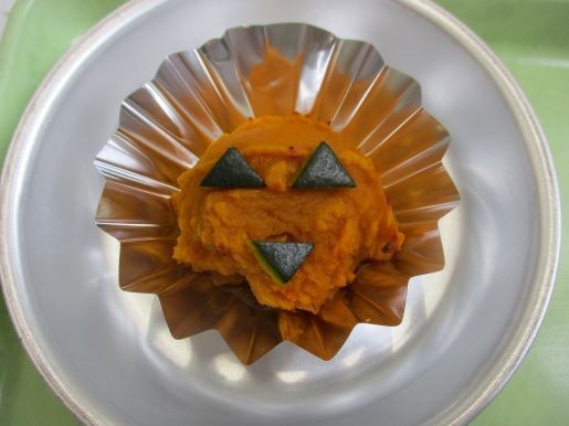 むいた皮を小さく切って「ジャック・オー・ランタン」風に目と鼻を乗せてみました。児童のみなさん全員にお届けできないのが、残念でした。