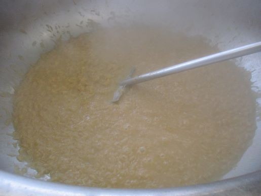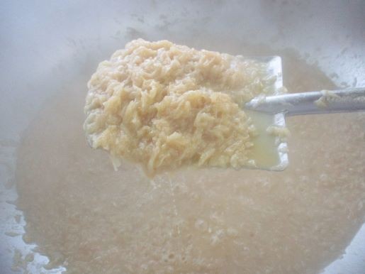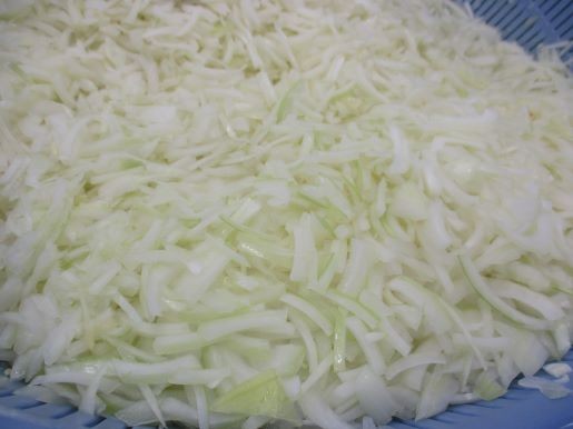 オニオンスープには、たまねぎを34キログラム使いました。生のたまねぎをよく炒めると1時間30分経つとこのような「あめ色たまねぎ」になります。