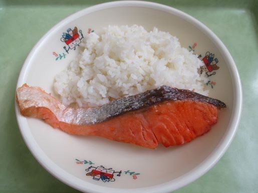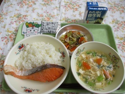 11日の給食は、ごはん、焼き魚(鮭)、豚肉とキャベツのみそ炒め、かきたま汁、牛乳です。今日、11月11日は「鮭の日」です。「鮭」の漢字のつくり「圭」を分解すると「十一十一」になることから、11月11日が鮭の日になりました。