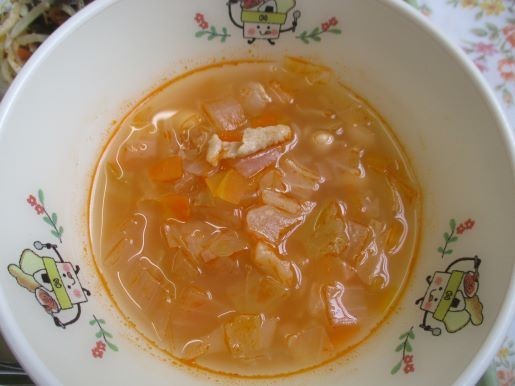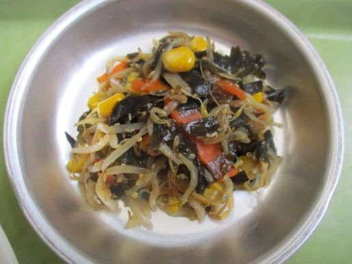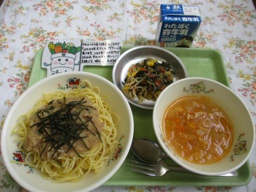 12日の給食は、はち大根おろしスパゲティー、温野菜のごまドレッシング、ミネストローネ、牛乳です。